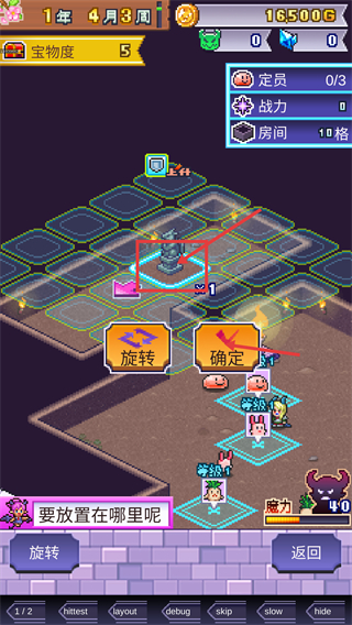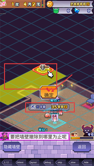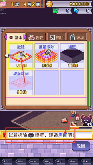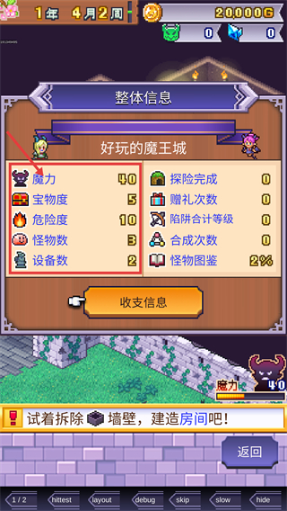 1、查看【整体信息】里的【魔力-40】【宝物度-5】等数值,按提示【试着拆除墙壁,建造房间吧。】推进城堡建设。