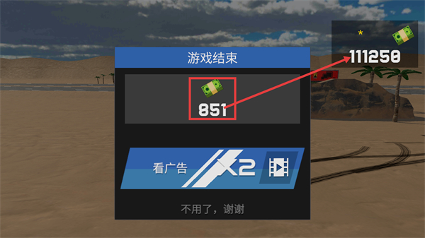 4、追逐赛结束后会显示851-与111258-奖励数值,可选择“看广告”获取X2奖励,也可选“不用了,谢谢”完成本次结算。