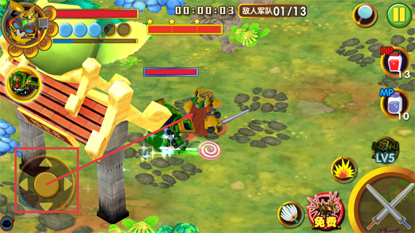 2、战斗界面用左侧方向控件操控角色,关注敌人军队-01/13进度,利用右侧HP-13与MP-10道具补给状态,及时发动技能攻击敌人。