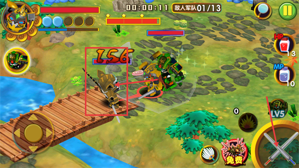 3、战斗时留意伤害数值-156,持续用方向控件调整角色位置,点击右侧攻击按钮输出伤害,推进敌人军队-01/13的击败进度。