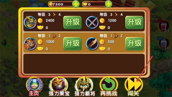 4、战斗结束后进入升级界面,消耗对应货币升级角色与装备,完成后点击闯关按钮继续挑战,积累资源提升战力。