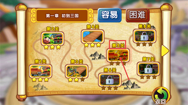 1、在【第一章-初到三国】关卡界面,前4关已满星通关,点击第5关进入挑战,界面有容易-困难难度可选,未通关关卡呈锁定状态。