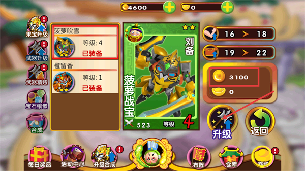 2、在果宝升级界面,【菠萝吹雪】-等级4与【橙留香】-等级1已装备,消耗3100-货币点击升级,提升【刘备-菠萝战宝】的属性。