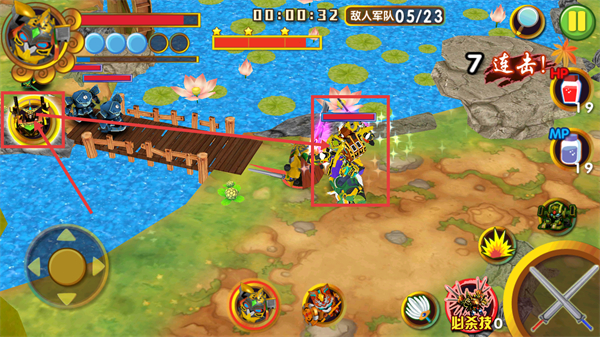 3、战斗界面中敌人军队-05/23,触发7-连击,调用副将协助作战,借助HP-19与MP-19道具续航,推进战斗进度。