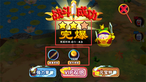 4、战斗成功获完爆评级,完成时间-01:43,领取普通奖励-武器与金币奖励-1500,可通过强力果宝强化战力。