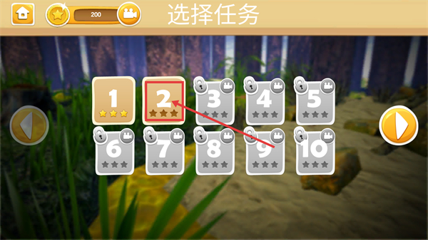 1、进入【选择任务】-界面,选定已解锁的【2】-任务,留意顶部显示的【200】-金币数值,确认后即可开启对应关卡内容。