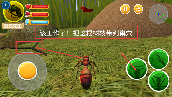 2、在任务中跟随【蚂蚁先生】-的提示,明确目标为将指定树枝运送至巢穴,可通过界面按钮操控角色进行移动。