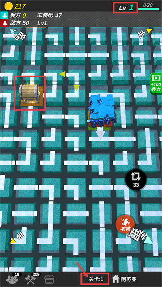 1、进入【关卡:1】界面,留意【217】-金币与【我方0】-【敌方50-Lv1】的兵力差,先获取界面中的【宝箱】来提升资源储备。