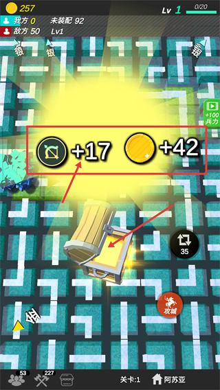 3、开启【宝箱】后可获得【+17】-弓箭与【+42】-金币,这些资源能强化兵力或装备,是推进关卡的重要补给。