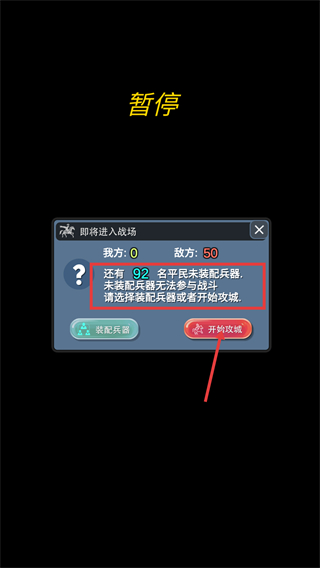 4、进入战场前会弹出提示,若有【92】-名平民未装配兵器,可先选【装配兵器】强化战力,再点击【开始攻城】。