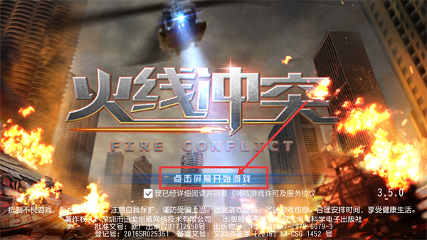 1、进入【火线冲突】-【FIRE-CONFLICT】的启动界面,勾选协议后点击【点击屏幕开始游戏】,即可进入游戏开启战斗流程。
