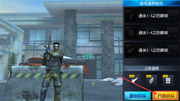 1、进入【游戏道具购买】界面,【手雷×5】需通关1-3解锁,【医疗包×3】通1-4,【火箭筒×5】通2-1,配置后点击【开始战斗】。