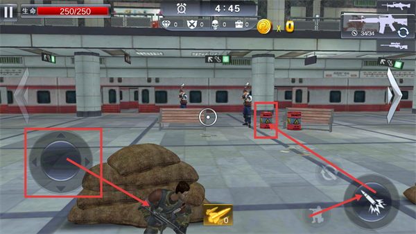 2、战斗界面中,通过【移动按钮】操控角色,利用场景内【油桶】触发爆炸伤敌,留意【250/250】的生命状态维持战力。