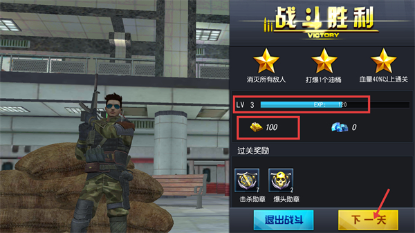 4、达成【战斗胜利】三星条件,升级至【LV3】获100金币与勋章,点击【下一天】即可进入下一关挑战。