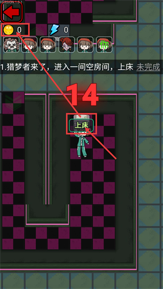 2、当【猎梦者来了】的提示出现时,操控角色进入空房间,点击界面中的【上床】按钮,完成该阶段的任务推进。