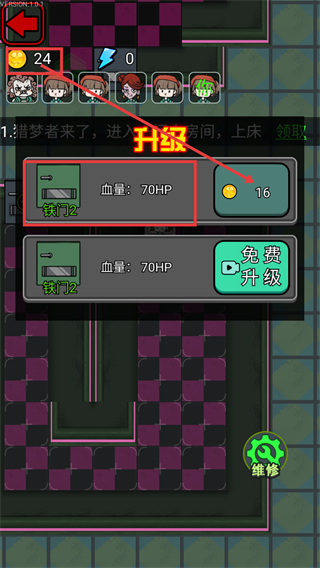 3、获取资源后进入升级界面,消耗16金币可升级【铁门2】至更高防御,也可选择【免费升级】来强化房间防护。