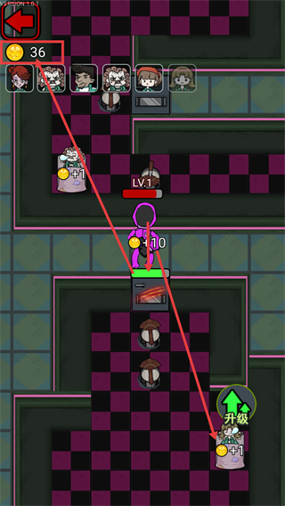 3、积累金币至【36】,攻击建筑可获【+10-金币】,其他角色的床也会产出【+1-金币】,可借助升级功能强化自身。