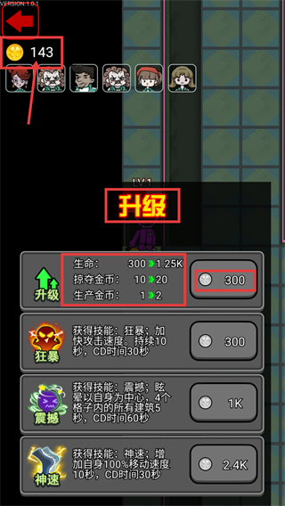 4、金币积累到【143】,消耗【300-纽扣】升级猎梦者,生命升至1.25K-掠夺金币提至20,还可解锁技能提升战力。