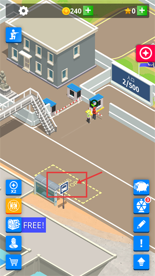 1、点击【公交站】区域触发对应功能,当前【人口-2/500】,该设施用于引入新角色,同时需留意顶部【金币-240】等资源的剩余情况。