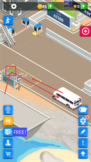 3、巴士抵达后点击【公交站】的交互标识,完成新兵接引操作,此时【人口-4/500】,资源同步更新,需持续关注设施状态。
