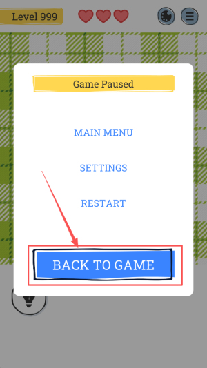 4、暂停菜单:在Level 999 Game Paused界面点击BACK TO GAME继续。