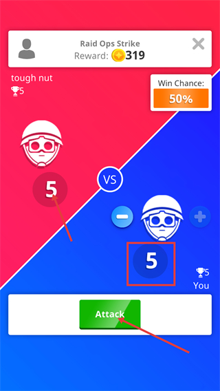 3、在【Raid-Ops-Strike】对战中,双方各部署【5-单位】,当前【Win-Chance-50%】,点击【Attack】发起攻击争夺【319-金币】奖励。