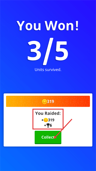 4、对战胜利后显示【You-Won!】,本次【3/5-Units-survived】,点击【Collect】可领取【319-金币】与【6-奖杯】的奖励。
