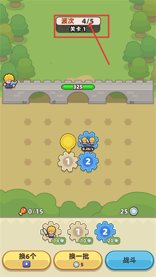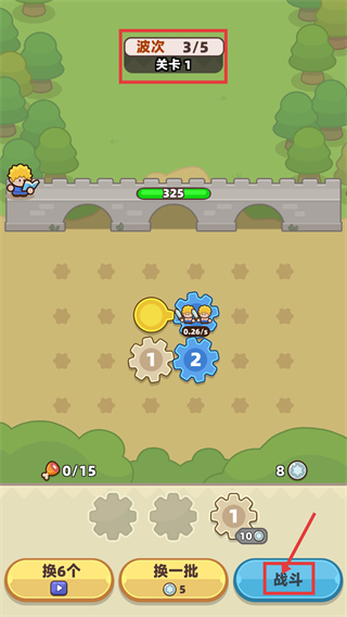 1、处于【波次-3/5】【关卡1】时,可点击【战斗】按钮开启本波对战,同时留意【0/15】的资源进度,利用场上单位推进战斗。