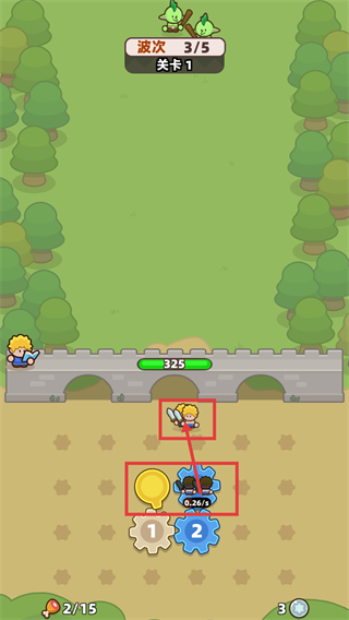 2、在【波次-3/5】【关卡1】进程中,单位会自动生成并推进,此时【2/15】资源进度提升,可借助【0.26/s】的产出强化单位。