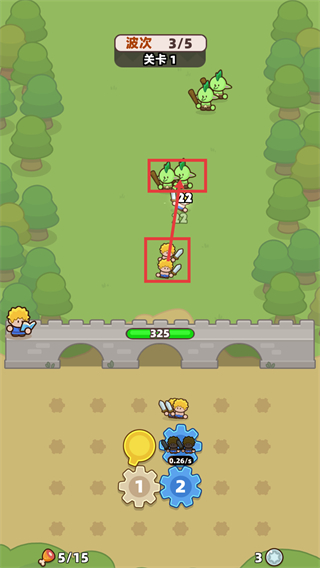 3、在【波次-3/5】【关卡1】的对战里,我方单位会与敌方怪物交战(单次伤害【22】),同时【5/15】资源进度持续累积。