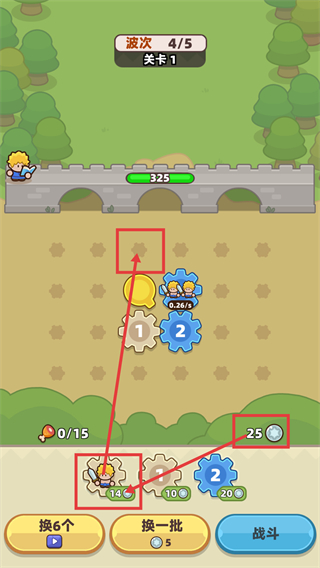 1、处于【波次-4/5】【关卡1】时,可消耗【14-钻石】兑换对应单位,当前持有【25-钻石】,准备配置单位开启本波战斗。