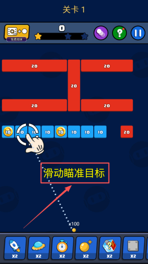 2、滑动瞄准:在关卡1界面,滑动屏幕调整瞄准线,对准目标后松手发射。