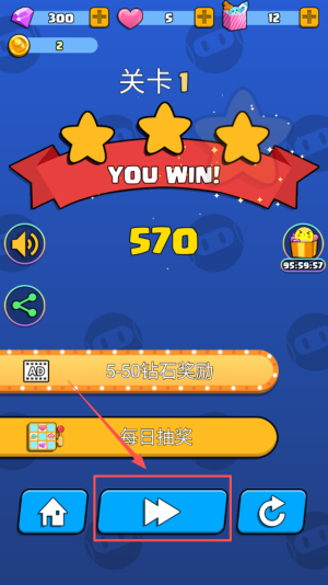 4、领取胜利:当界面弹出“YOU WIN!”与“300”积分时,点击“奖励”或“每日抽奖”领取钻石。