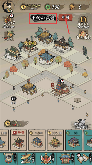 1、处于【十线小武馆】阶段时,点击【晋升】按钮参与武馆晋级赛,武馆内建筑会持续产出收益,以此推进武馆等级提升流程。