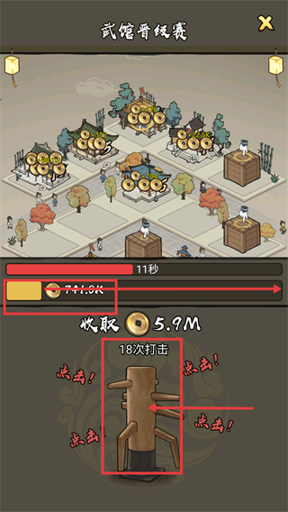 2、进入武馆晋级赛后,通过点击木桩完成【18次打击】,积累进度条,进度完成后可获取对应收益,加速武馆晋升进程。