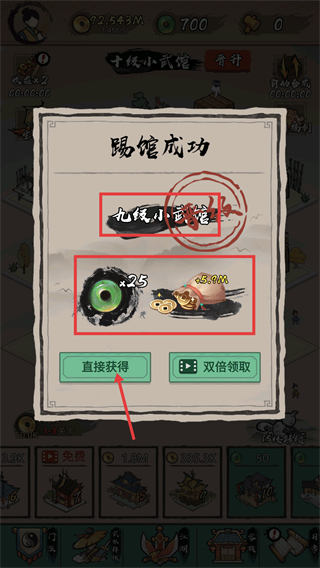 3、晋级赛完成后踢馆成功,武馆晋升为【九线小武馆】,点击【直接获得】领取【25-绿色资源】与【5.9M-金币】奖励。