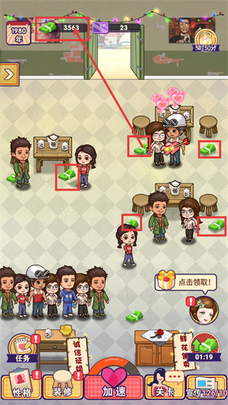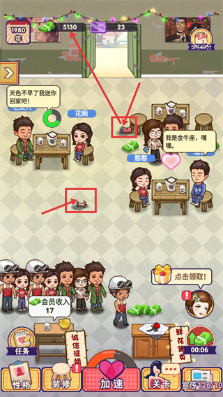 2、顾客互动进度完成后,场景内会生成货币奖励,点击收集可提升货币资源数量,同时成功撮合顾客会触发爱心特效。