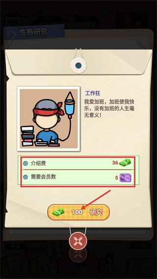 2、点击【工作狂】查看介绍,解锁需支付36-介绍费与5-会员数,消耗100-资源点击【研究】即可获取该性格。