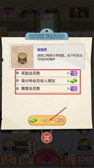 4、查看【破圆凳】的【设备详情】,其可增2-会员数与每分钟2-会员收入,耗5-会员数及130-资源点击【购买】获取。