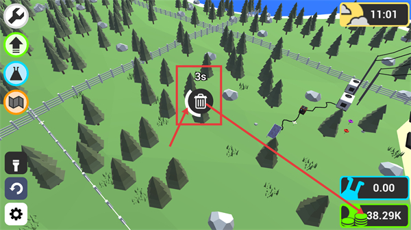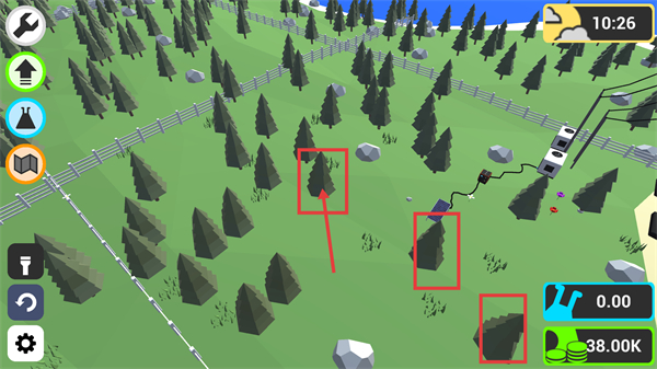 1、在主界面中,定位标注的树,当前38.00K-资源可用,先锁定这些树的位置,为后续的销毁及设施布置做前期准备。