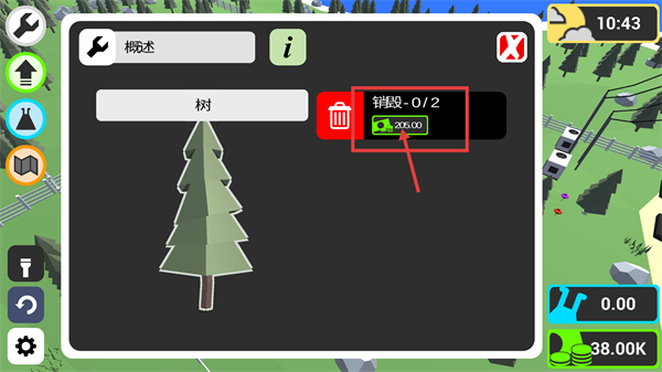 2、点击树打开【概述】界面,查看【销毁-0/2】的任务目标,确认需消耗205.00-对应资源,准备执行树的销毁操作。