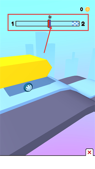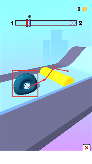 2、关卡中操控轮胎向黄色设施方向移动,通过上方进度条查看“你”的位置,跟随指引推进关卡的进程。