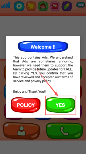 1、接受协议:首先打开欢迎界面,阅读广告说明与隐私政策,点击“YES”接受协议并进入主界面。
