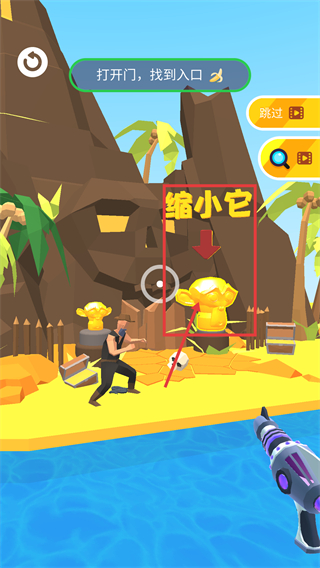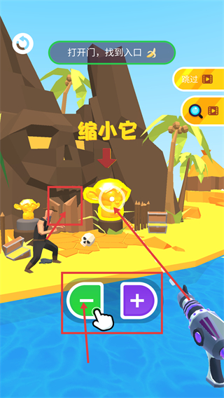 1、进入该关卡后,任务为【打开门,找到入口】,需关注红色框标注的【缩小它】提示,目标为对应的金色雕像。