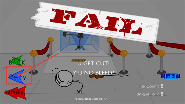 4、触发机关后进入【FAIL】界面,点击红色框标注的【Retry】按钮重新挑战,本次需调整策略,优先借助道具规避钻石周边的机关。