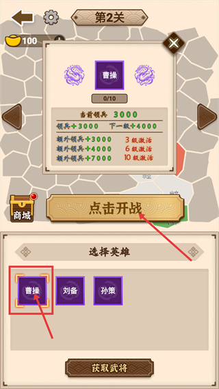 1、在【第2关】选择【曹操】作为出战英雄,当前领兵3000,升级后可解锁额外领兵,选好后点击【点击开战】进入对局。