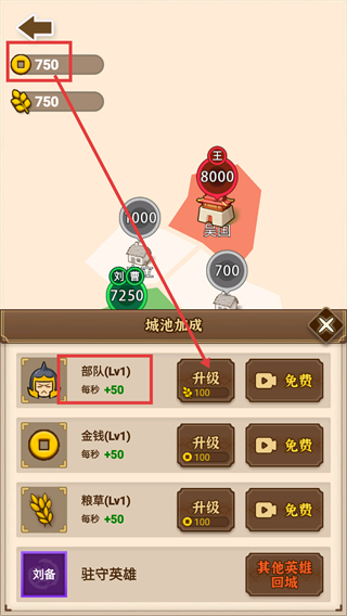 3、通过攻占据点获取资源后,可升级【部队(Lv1)】等城池加成,提升每秒收益,快速积累兵力与资源。