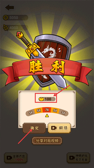 4、胜利结算时可获得100金币奖励,点击【确定】领取,也可通过看广告【翻倍】奖励,完成后可分享对局视频。