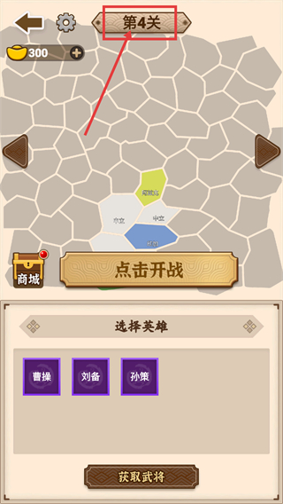 4、通关后进入【第4关】,可选择曹操、刘备、孙策任一英雄,点击【点击开战】开启新关卡的据点争夺。