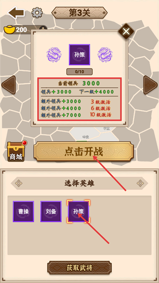 1、在【第3关】选择【孙策】出战,当前领兵3000,升级后可解锁额外领兵加成,选好英雄后点击【点击开战】进入对局。
